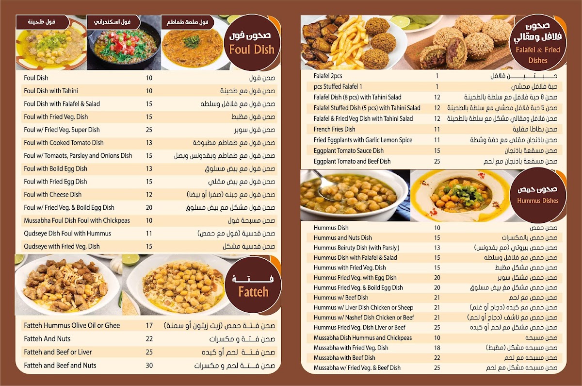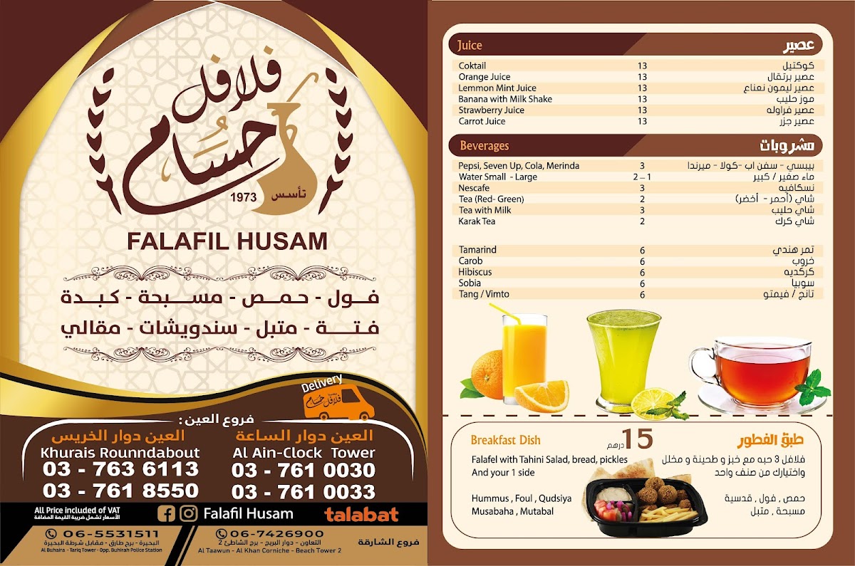 Welcome to Falafel Husam, a hidden gem located in the Central District of Hai Al Qasr, Abu Dhabi. This delightful eatery is renowned for its authentic Egyptian cuisine, particularly its mouthwatering falafel and creamy hummus. The menu caters to both locals and visitors, offering dishes in English and Arabic, complete with vivid images that showcase each offering.